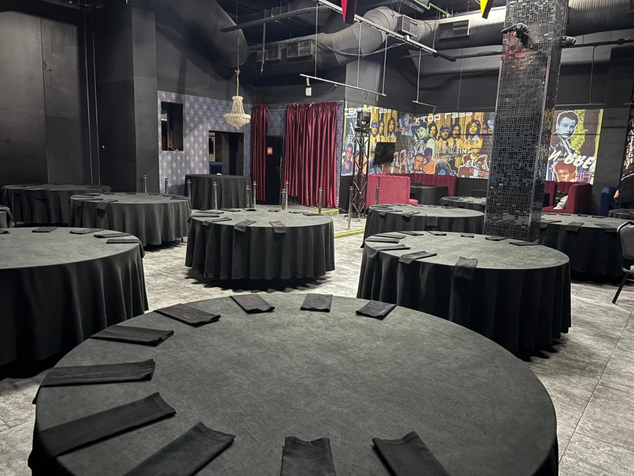 Элегантный дизайн. Чёрный цвет универсален и подойдёт для любого мероприятия. Круглые скатерти создают гармоничную атмосферу и подчёркивают стиль оформления.